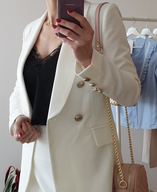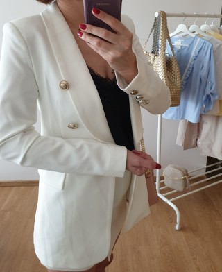 Marynarka to niezbędny element damskiej garderoby. Biała marynarka zawsze będzie idealnie pasować do eleganckich stylizacji. Marynarka ozdobiona srebrnymi guzikami, taliowana, na podszewce, poduszki. Wysoka jakość materiału, z którego wykonano marynarkę.