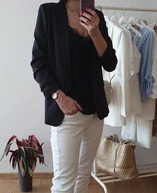 Marynarka to niezbędny element damskiej garderoby. Idealna do eleganckich stylizacji oraz świetnie się sprawdzi do zwykłego t- shirtu i jeansów. Delikatnie taliowana. Podszewka. Marszczone rękawy. Poduszki. Wysoka jakość materiału, z którego wykonano marynarkę.