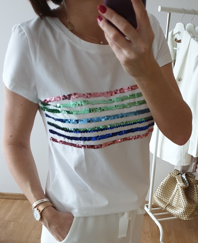 T-shirt White idealny do codziennych stylizacji, ozdobiony cekinami. Wysoka jakość bawełny.
